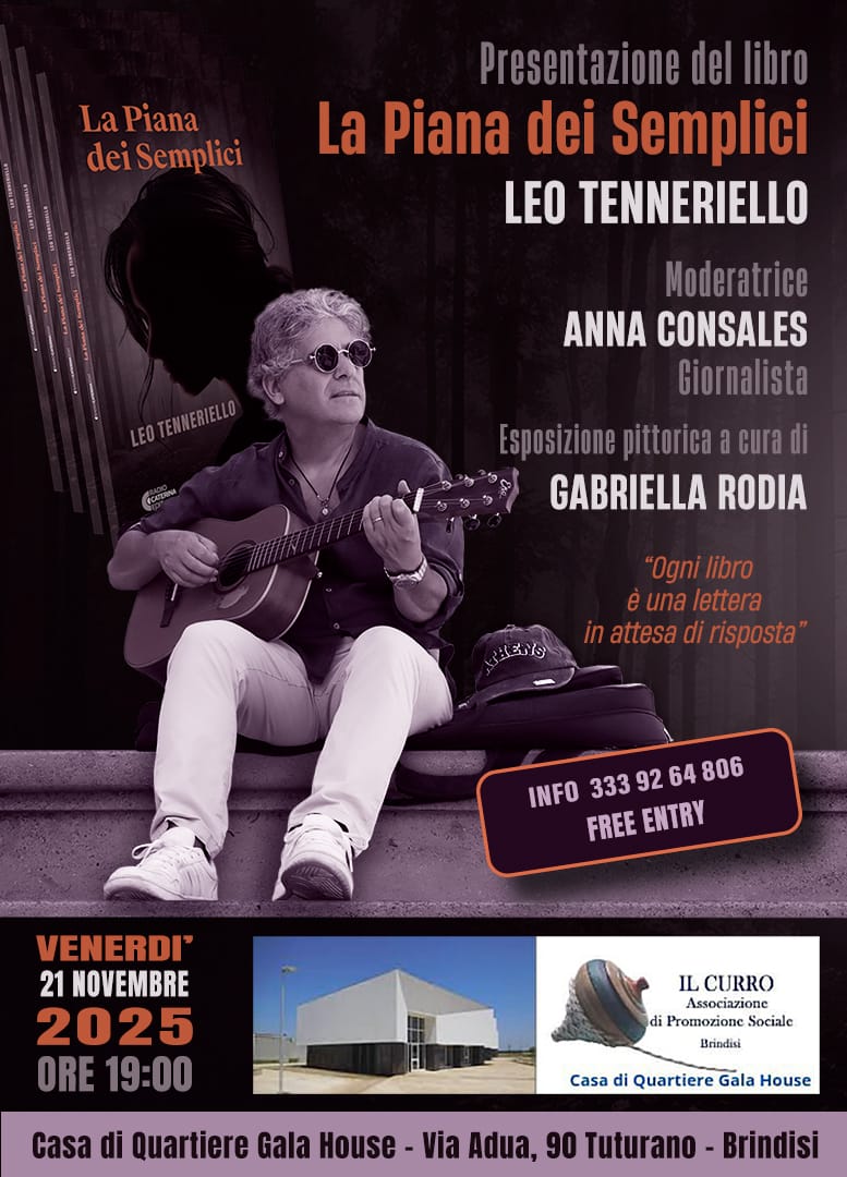 La Casa di Quartiere Gala House di Tuturano ospiterà venerdì 21 novembre alle ore 19.00 la presentazione del nuovo romanzo di Leo Tenneriello, cantautore e scrittore, dal titolo “La Piana dei Semplici”.