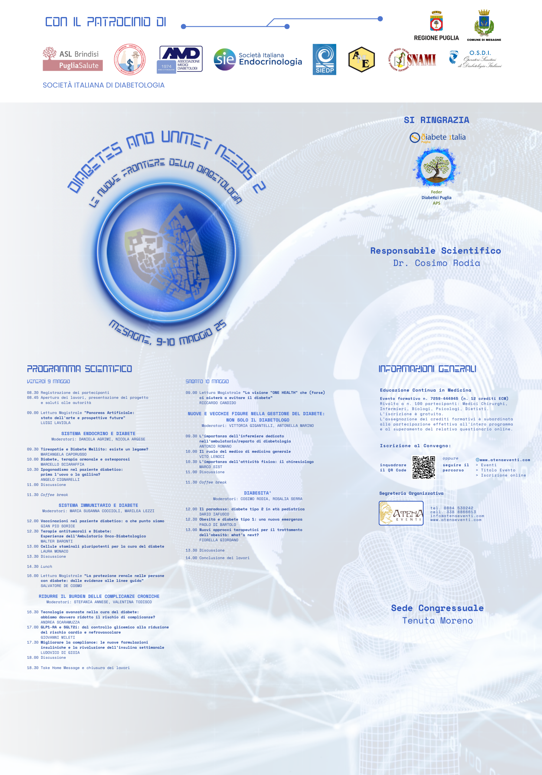 Il congresso sarà anche l’occasione per aprire un dialogo con la comunità: sabato 10 maggio alle ore 17:00, presso l’Auditorium del Castello comunale di Mesagne, si terrà il “Diabetes and Unmet Needs TALK SHOW”, un momento di confronto aperto e coinvolgente tra specialisti, pazienti e caregiver. L’incontro, a ingresso libero, sarà moderato dal prof. Dario Iafusco e vedrà la partecipazione della ricercatrice Dott.ssa Laura Monaco (Ospedale San Raffaele), del Dott. Andrea Scaramazza e del dott. Walter Baronti, pronti a rispondere alle domande del pubblico. A rendere possibile l’organizzazione di questo evento sono state anche le sinergie del territorio. Si ringraziano per il prezioso sostegno il Comune di Mesagne e gli sponsor locali: Centro Diagnostico OMEGA, Polispecialistico Devicienti, Studio95grafica, Italphoto, Dolce Forno e Habitat Azzarito. Un esempio concreto di come, unendo le forze, si possano costruire percorsi di valore per tutta la comunità.