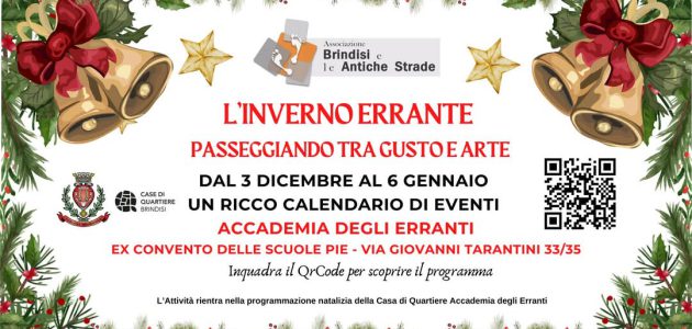 Brindisi si prepara a vivere un dicembre ricco di appuntamenti grazie a L’Inverno Errante, il programma di iniziative promosso dall’A.P.S. Brindisi e le Antiche Strade insieme alla Casa di Quartiere Accademia degli Erranti, a Slow Food Brindisi e a numerose realtà associative e produttive del territorio. Dal 3 dicembre 2025 al 6 gennaio 2026, l’Ex Convento delle Scuole Pie tornerà a trasformarsi in uno dei luoghi simbolo della stagione natalizia cittadina.