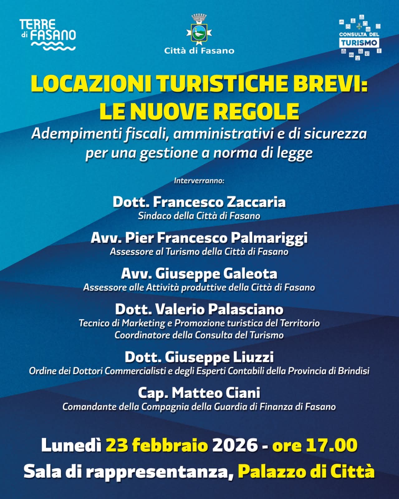 Il Comune di Fasano conferma così il proprio impegno nel promuovere momenti di studio, aggiornamento e dibattito su temi che incidono concretamente sulla vita degli operatori economici e dei cittadini.
