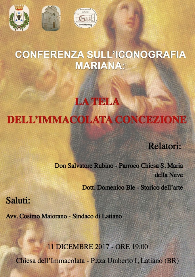 L’Associazione Culturale “Good Morning”, in collaborazione con la Parrocchia Santa Maria della Neve e con il patrocinio dell’Amministrazione Comunale di Latiano, organizza Lunedì 11 dicembre alle ore 19:00 presso la Chiesa dell’Immacolata una conferenza sull’iconografia mariana dal titolo: “LA TELA DELL’IMMACOLATA CONCEZIONE”.