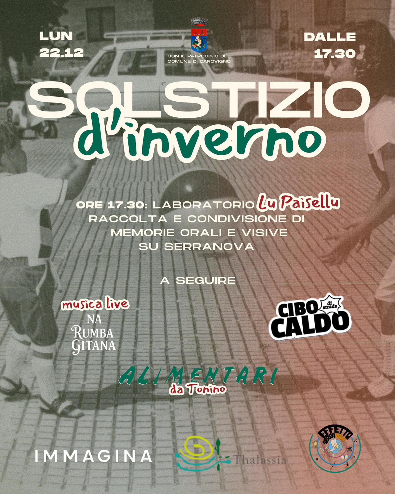 In occasione del Solstizio d’Inverno, Immagina Photography and Culture organizza un momento di memoria e restituzione aperto a tutti e a tutte, dedicato alla raccolta collettiva di storie, ricordi e immagini, con l’obiettivo di continuare a costruire insieme il racconto di Serranova e della sua comunità