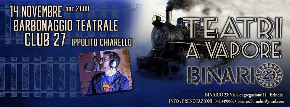 Una serata all’insegna del Rock per il nuovo appuntamento con Teatri a Vapore, la rassegna di Binario23 diretta da Meridiani Perduti Teatro. Martedì 14 novembre 2017 ore 21 Ippolito Chiarello in Barbonaggio Teatrale CLUB 27 – testi di Francesco Niccolini. Un uomo radio. Un palchetto e un mixer. Un microfono per la radio. 10 storie. 10 miti, quelli del rock, esattamente quelli del Club 27.
