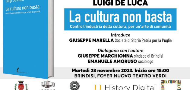 Martedì 28 novembre alle ore 18.00 il foyer del teatro “Giuseppe Verdi” di Brindisi ospiterà la presentazione del libro La cultura non basta di Luigi De Luca, appena uscito per Edizioni dell’Asino, casa editrice coordinata da Goffredo Fofi. L’autore, dopo gli studi in semiologia a Bologna, sceglie di tornare in Puglia dove approda alla carriera pubblica. Si è occupato di teatro, cinema, musei, biblioteche e cooperazione euro-mediterranea. La gestione del patrimonio culturale in una prospettiva di cooperazione territoriale è il campo nel quale si colloca il suo impegno attuale.
