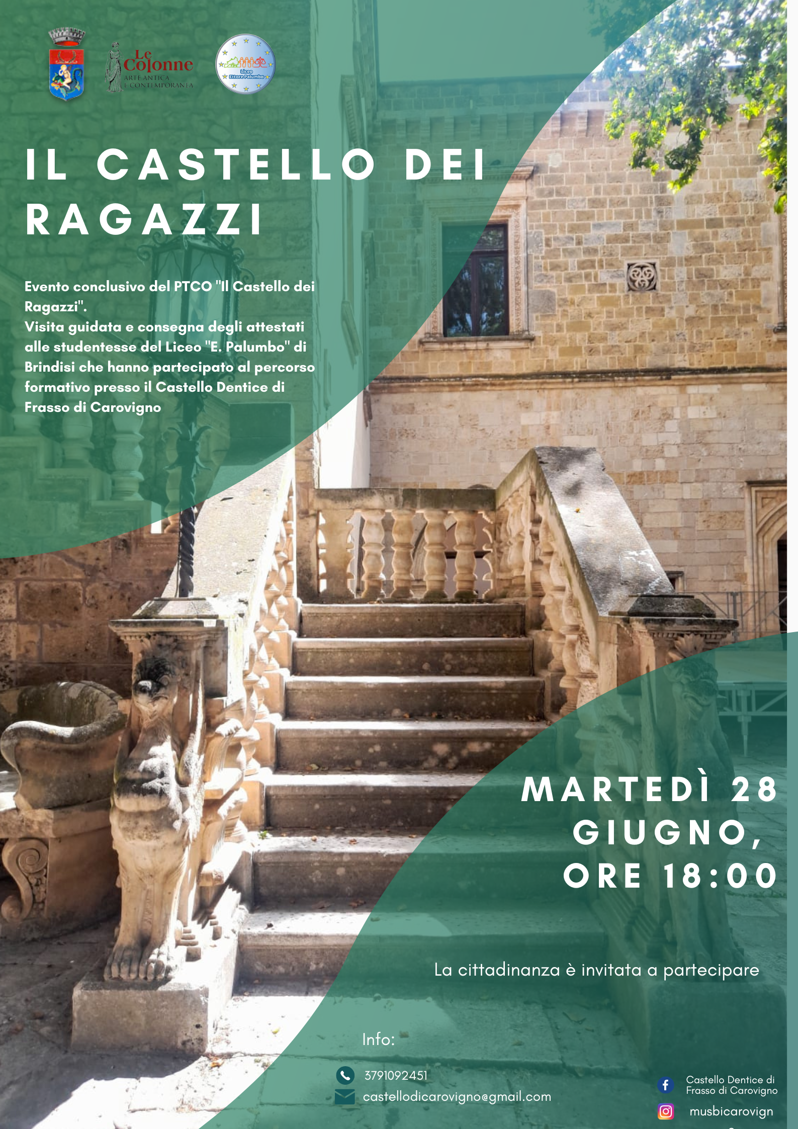 Si conclude martedì 28 giugno alle ore 18,00 presso il Castello Dentice di Frasso di Carovigno il Ptco (Percorsi per le competenze trasversali e l’orientamento) di alcune studentesse del Liceo delle Scienze Umane e Linguistico Palumbo di Brindisi. Le alternanti hanno scelto di vivere quest’esperienza formativa nel bellissimo Castello di Carovigno partecipando al progetto “Il Castello dei Ragazzi’.