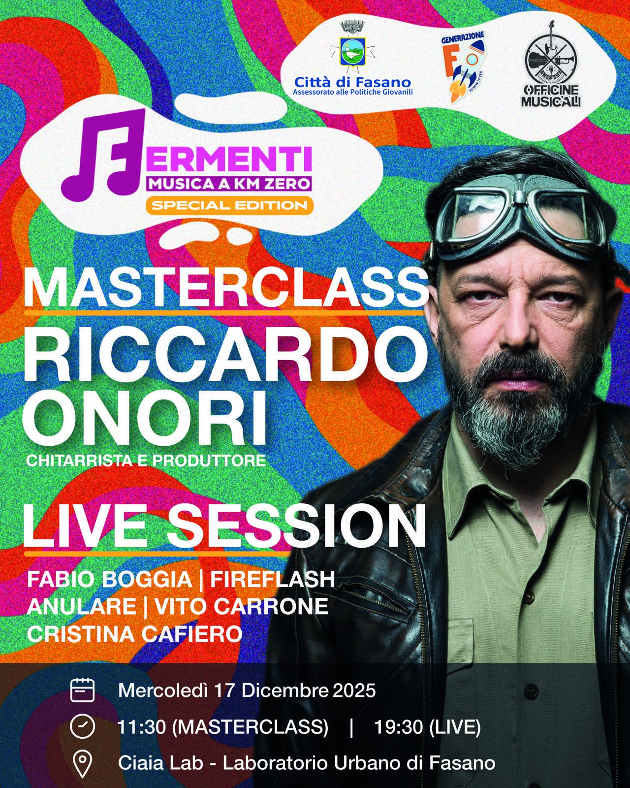 Chitarrista, compositore e produttore, Riccardo Onori è una delle figure più versatili della musica italiana. Storico chitarrista di Jovanotti e cardine della sua band, vanta collaborazioni con artisti italiani e internazionali, tra cui Robbie Williams, Enrico Rava e Stefano Bollani. A Fasano, Onori metterà la sua esperienza al servizio dei giovani talenti guidandoli in un workshop intensivo, in sessioni di prove dedicate e in una performance live finale aperta al pubblico.