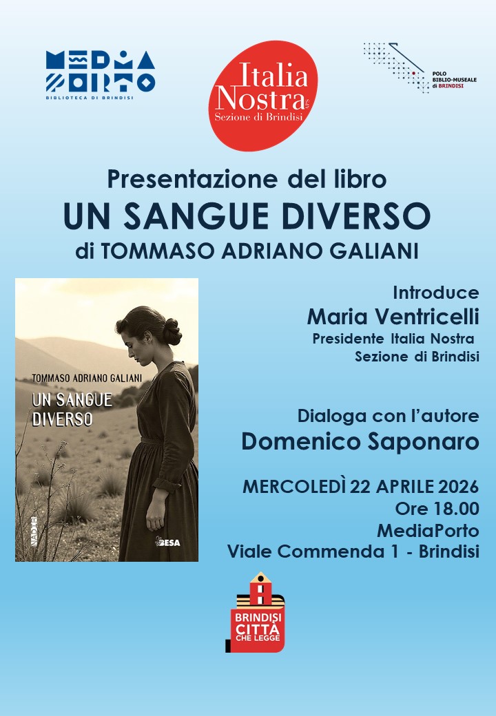 Mercoledì 22 aprile 2026 alle 18,00 nella sala del MediaPorto di Brindisi (viale Commenda 1), sarà presentato l’ultimo impegno letterario di Tommaso Adriano Galiani, storico dell’arte e docente, il romanzo «Un sangue diverso» (BESA Editore, 2025).