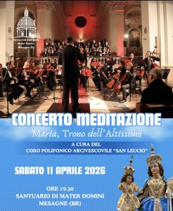 Sempre sabato 11 aprile, ma sul versante della proposta culturale e spirituale, il Santuario ospiterà alle 19.30 il Concerto-Meditazione “Maria, Trono dell’Altissimo”. Protagonista il Coro Polifonico Arcivescovile “San Leucio”, che offrirà un itinerario musicale pensato per accompagnare il raccoglimento e la preghiera.