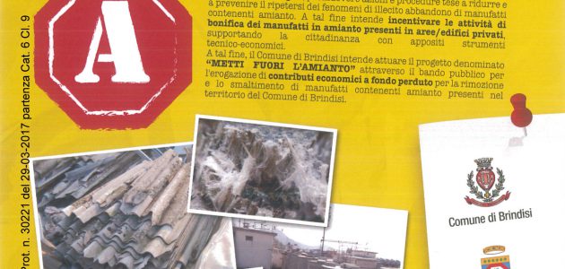 Il presente bando disciplina le procedure dirette alla concessione ed erogazione di un contributo comunale a beneficio di coloro che intendano effettuare interventi volti alla rimozione e smaltimento di manufatti contenenti amianto esistenti sul territorio del Comune di Brindisi avvalendosi di ditta specializzata individuata con apposita procedura di gara dall’Amministrazione Comunale. I fondi necessari all’attuazione del presente progetto ammontano complessivamente a € 65.0000,00 così ripartiti: