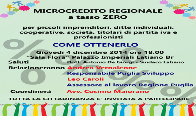 Per diffondere quanto più possibile il contenuto, le finalità e le modalità di accesso al Microcredito d’Impresa, si è voluto organizzare un convegno che si terrà giovedì 4 dicembre, ore 18,00, presso la “Sala Flora” del Palazzo Imperiali di Latiano.