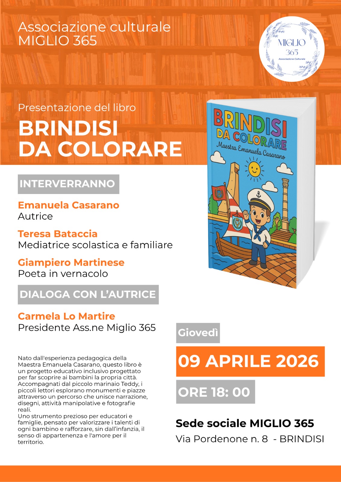 L’Associazione Culturale Miglio 365 rinnova il suo impegno per la promozione della cultura e del territorio ospitando, giovedì 9 aprile alle ore 18:00, un evento speciale dedicato alla scoperta della città di Brindisi attraverso gli occhi dei più piccoli. Presso la sede sociale di via Pordenone n. 8, si terrà infatti la presentazione del libro “Brindisi da colorare”, un progetto educativo ideato dalla Maestra Emanuela Casarano per accompagnare i bambini tra monumenti e piazze storiche con un approccio ludico e inclusivo.