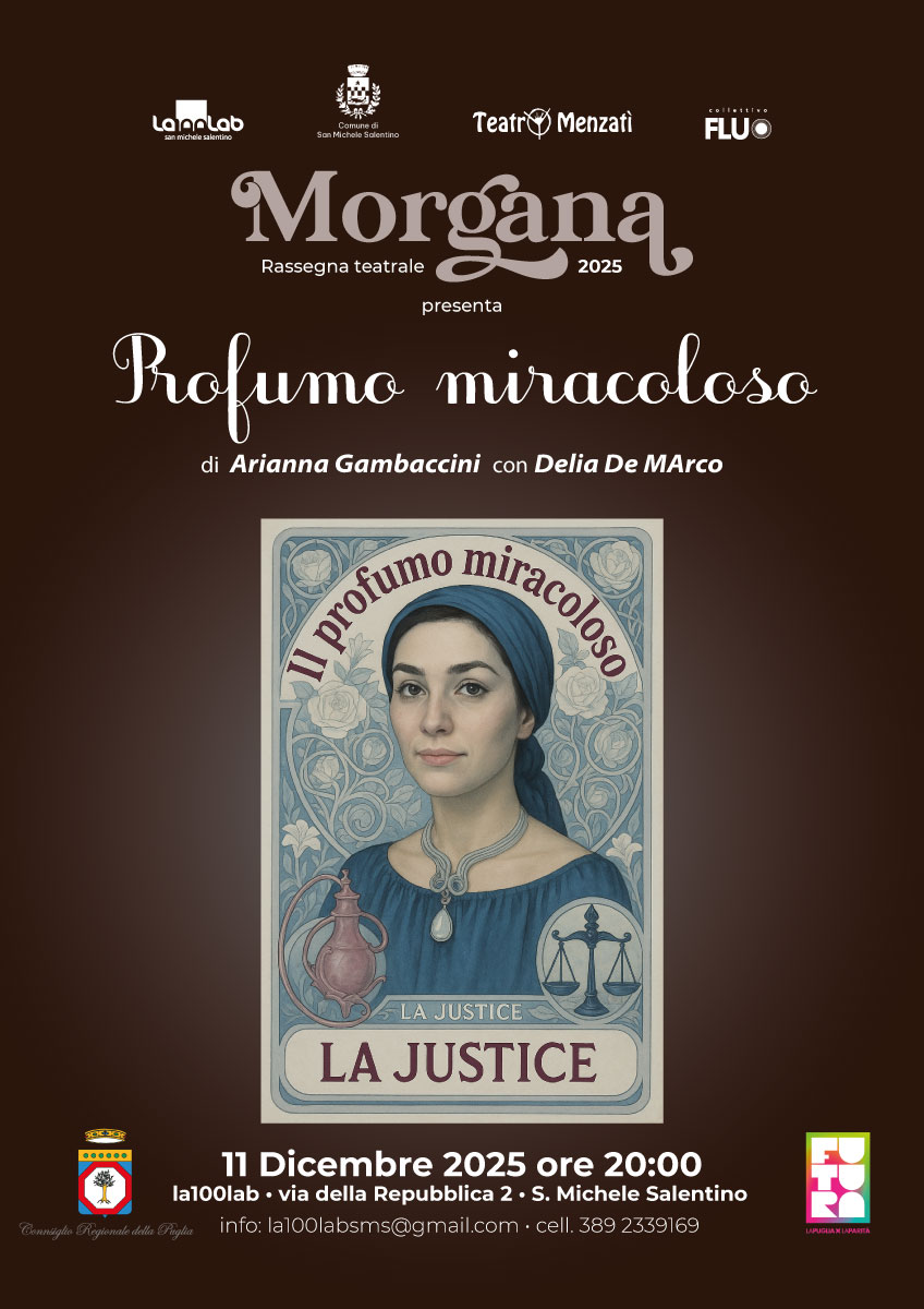 Si conclude l’edizione 2025 di Morgana, la rassegna teatrale ideata da Se Puede Cooperativa Sociale e ospitata negli spazi di la100lab a San Michele Salentino. Un percorso dedicato alle narrazioni femminili, ai loro archetipi e ai loro movimenti interiori, che nel corso dei mesi ha portato in scena voci, storie e sguardi capaci di attraversare lo spettro umano con coraggio e profondità.