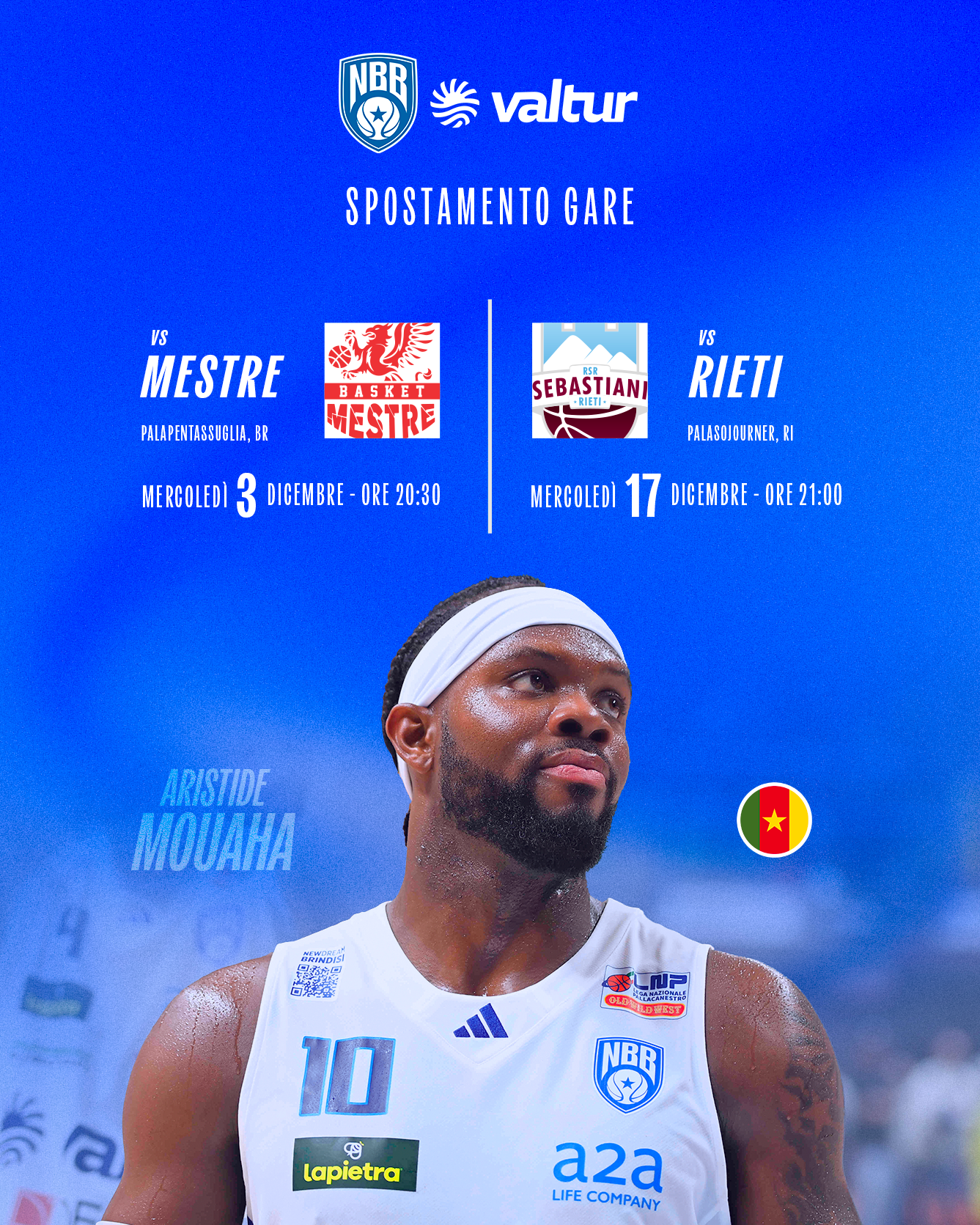 Quattordicesima giornata: Valtur Brindisi-Gemini Mestre, originariamente prevista mercoledì 26 novembre, è stata spostata alle ore 20:30 di mercoledì 3 dicembre 2025 al PalaPentassuglia.