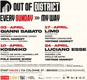 È il nuovo volto del My Way che presso i propri spazi di via Colonne, 57 in una delle aree più rappresentative del Capoluogo Adriatico propone la rassegna musicale e artistica presentata da Out Of District, il nuovo progetto intrapreso da 5 DJ: Andrea lpr, Dodo, Paolo De Mitri, Refresh e David.One che sono i resident degli eventi al My Way per gli appuntamenti di aprile.