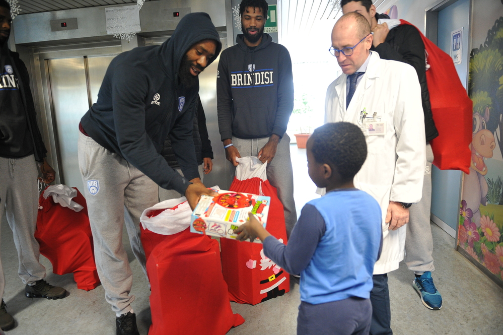 Una mattinata da ricordare per i bambini del reparto pediatria dell’ospedale “A. Perrino” di Brindisi che hanno ricevuto regali e sorprese direttamente dai giocatori della Happy Casa Brindisi, in versione natalizia per la speciale occasione.