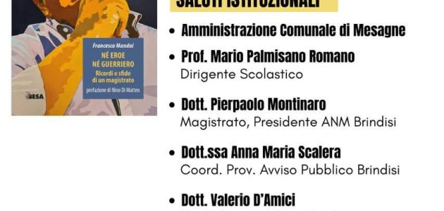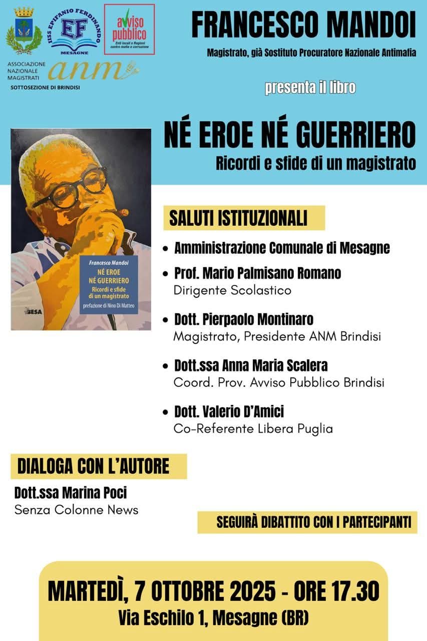 Martedì 7 ottobre, dalle ore 17.30 presso la sede dell’Istituto di Istruzione Secondaria Superiore “Epifanio Ferdinando” di Mesagne, in via Eschilo, il magistrato Francesco Mandoi, già Sostituto Procuratore Nazionale Antimafia e Antiterrorismo, presenterà il suo libro “Né eroe né guerriero – Ricordi e sfide di un magistrato” (Besa Editrice, 2025).