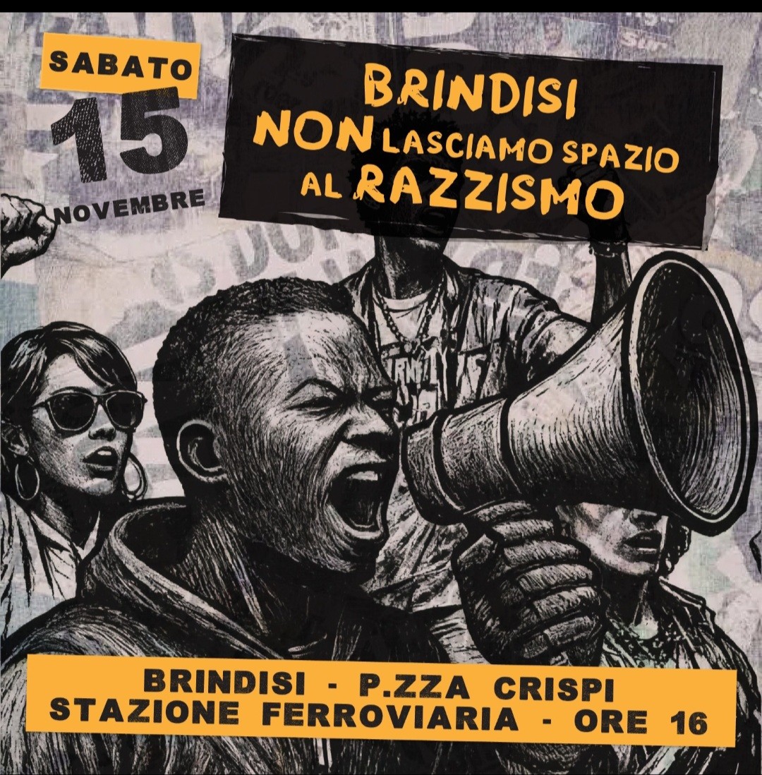 Sabato 15 novembre alle ore 16.00 invitiamo a partecipare al sit-in pubblico organizzato da 25 associazioni per dire che né a Brindisi né altrove c’è spazio per la violenza e il razzismo.