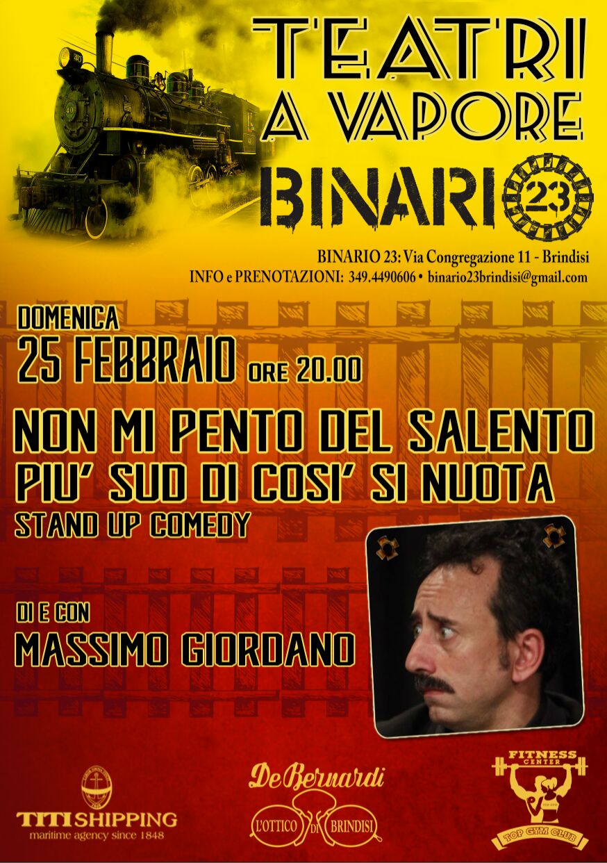Domenica 25 febbraio, alle ore 20.00, torna Teatri a vapore, la rassegna teatrale diretta da Meridiani Perduti e Binario23. In scena, la divertentissima stand up comedy di Massimo Giordano.