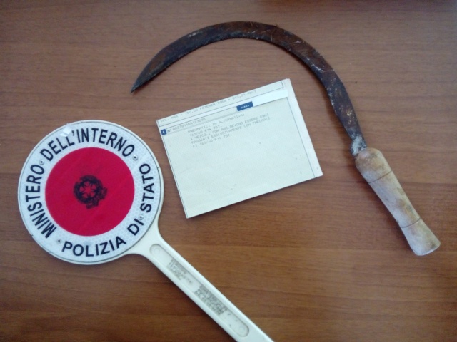 Simultaneamente al riferito controllo, personale della Squadra Volante unitamente a quello del Reparto Prevenzione Crimine di Lecce, nell’occasione a disposizione del Commissariato ostunese, procedeva al controllo di un’autovettura che, da apposito approfondimento, risultava sprovvista di copertura assicurativa nonché condotta da un pluripregiudicato del posto sul cui conto pendeva un provvedimento di sospensione della patente di guida. Così, al fine di una migliore ricostruzione dell’intera vicenda ed, avendo il sospetto che il soggetto potesse occultare armi all’interno dell’abitacolo del mezzo, si procedeva alla conseguenziale perquisizione veicolare che, di fatti, consentiva di rinvenire una falce di metallo con lama seghettata che, stando alla mancanza di attuale occupazione del fermato, lo stesso deteneva illegalmente e che veniva sottoposta a sequestro penale.
