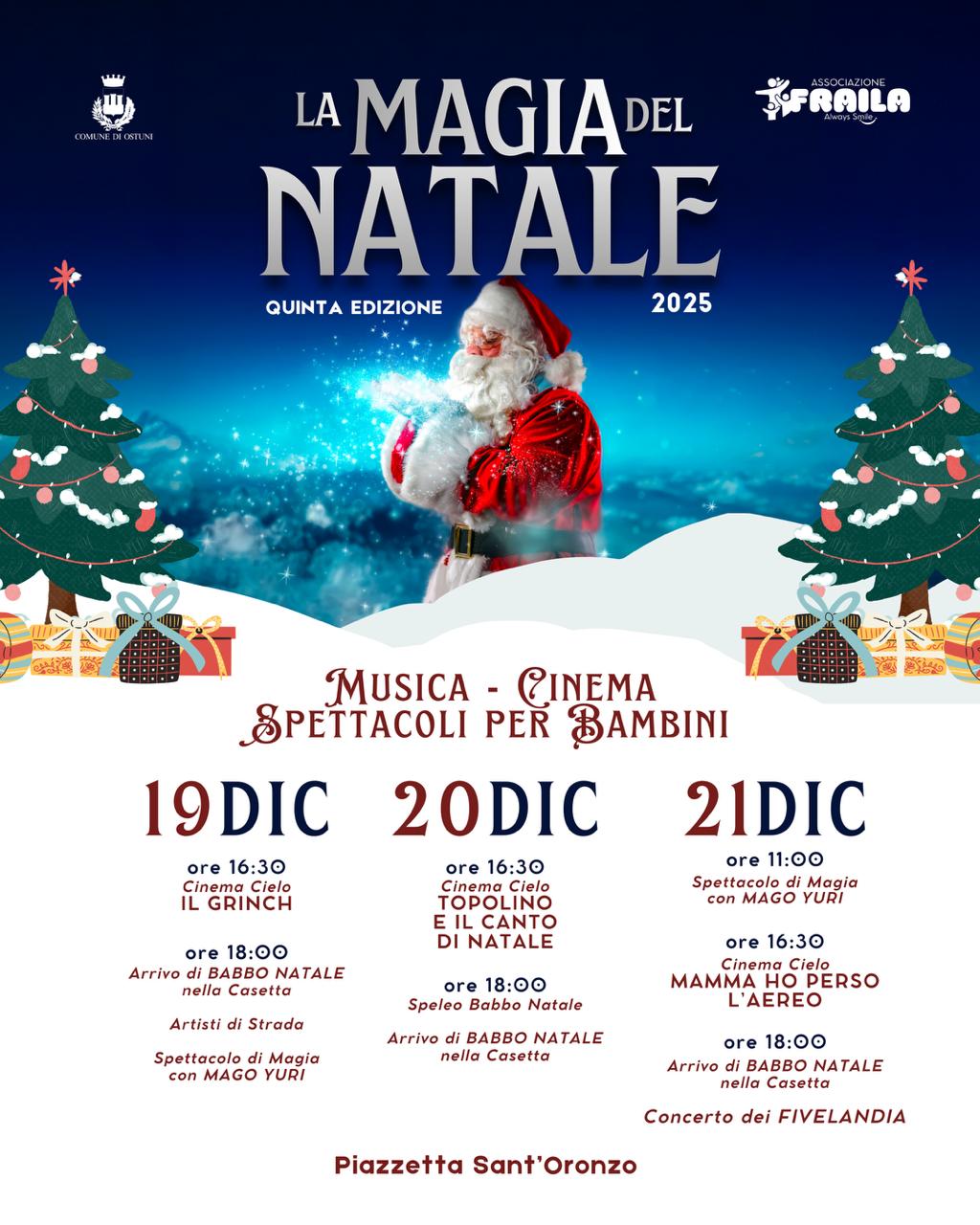 Per il quinto anno consecutivo, Ostuni si prepara a vivere l’atmosfera più attesa dell’anno con La Magia del Natale, l’evento natalizio a cura dell’Associazione Fraila APS, in programma il 19, 20 e 21 dicembre 2025 in Piazzetta Sant’Oronzo.