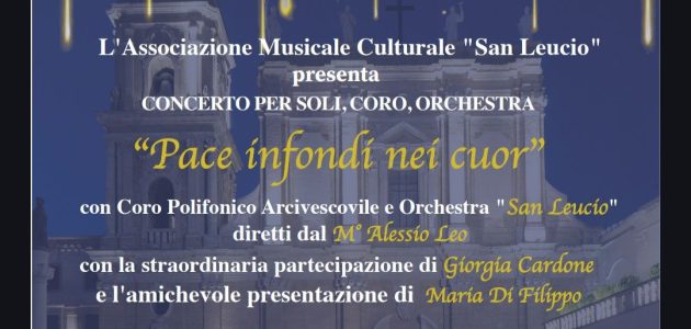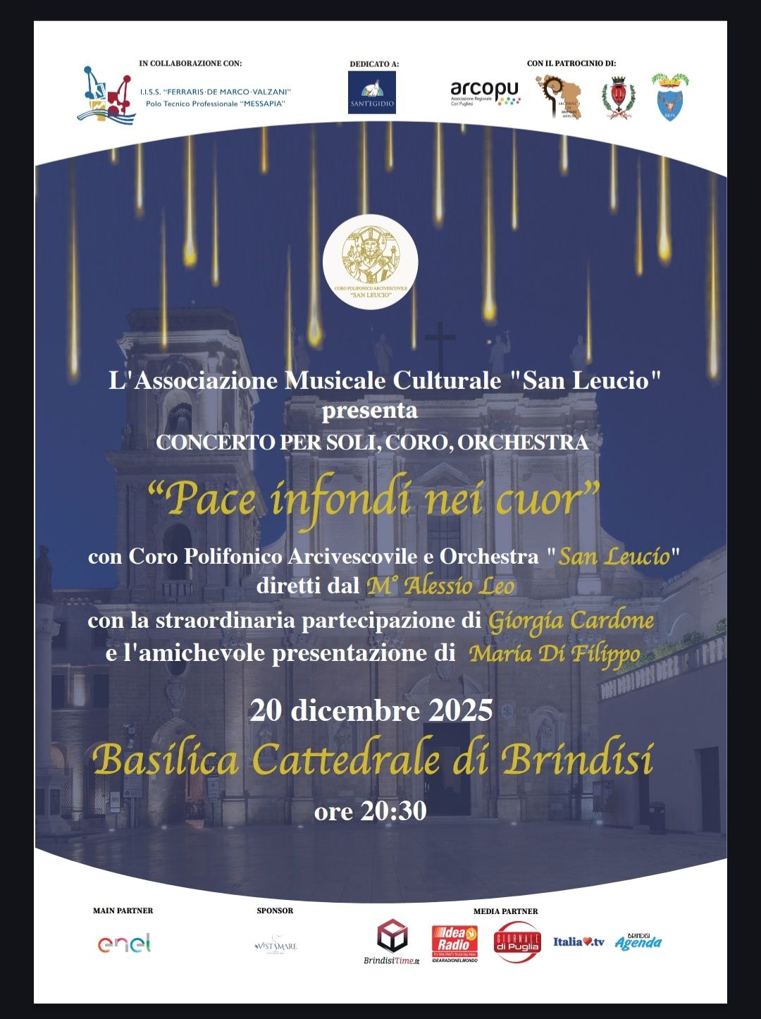 L’Associazione musicale-culturale “S. Leucio”, con la collaborazione dell’associazione Arcopu (Associazione Regionale dei Cori Pugliesi), con il patrocinio dell’Arcidiocesi di Brindisi-Ostuni, del Comune di Brindisi, della Provincia di Brindisi e con il media partenariato del quotidiano online www.brindisitime.it, Giornale di Puglia e Italia Love Tv, la radio, Idea Radio nel Mondo e del settimanale, Agenda Brindisi e con il sostegno di Enel e del petit lounge bar “VISTAMARE”, presenta il concerto di Natale 2025, dal titolo “Pace infondi nei cuor”.