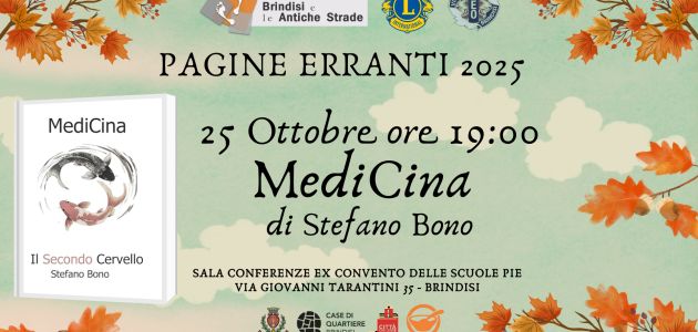 L’incontro si terrà sabato 25 ottobre ore 19:00, presso la Sala Conferenze della Casa di Quartiere dell’Accademia degli Erranti, in Via Giovanni Tarantini 35 (1°Piano – Ex Convento delle Scuole Pie), dove verrà presentato il libro “MediCina” di Stefano Bono.