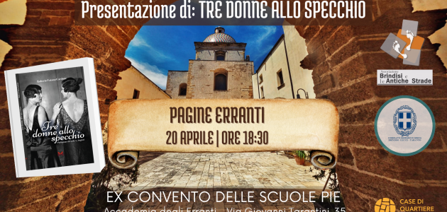 L’incontro si terrà sabato 20 aprile ore 18:30, presso la Sala Conferenze dell’Accademia degli Erranti – Ex Convento delle Scuole Pie, Via Giovanni Tarantini 35 (1°Piano), dove avremo il piacere di presentare “TRE DONNE ALLO SPECCHIO”, il nuovo libro di ROBERTO FATANO CARDONE.