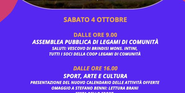 La giornata si apre alle ore 9.00 con l’Assemblea pubblica di Legami di Comunità alla quale partecipano tutti i soci della cooperativa. I lavori si aprono con i saluti del Vescovo di Brindisi, Mons. Intini.