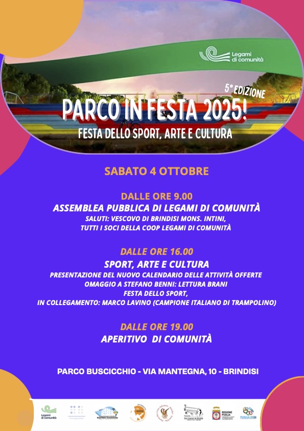 Sabato 4 ottobre 2025 Parco Buscicchio (via Mantegna 10, Brindisi) ospita la quinta edizione di Parco in Festa, l’iniziativa promossa da Legami di Comunità per celebrare, attraverso sport, arte e cultura, il valore della socialità e della partecipazione.