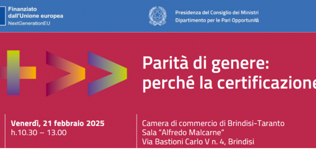 I0l Comitato Imprenditoria Femminile della Camera di Commercio Brindisi- Taranto, d’intesa con Unioncamere Nazionale e con il supporto tecnico di Dintec, sta organizzando l’evento «Parità di genere: perché la certificazione ? » al fine di favorire l’adozione di politiche per la parità di genere e per l’empowerment femminile a livello aziendale.