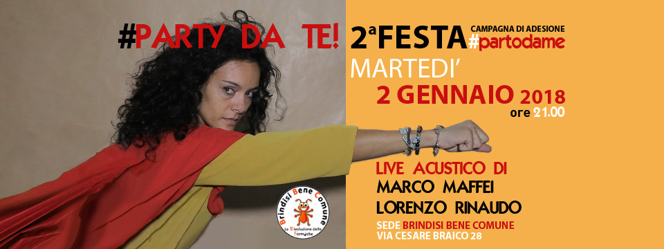Prosegue la campagna di adesione “Party da te!” e si arricchisce di un secondo appuntamento il 2 gennaio alle ore 21.00 nella sede di Brindisi Bene Comune in via Cesare Braico 28. La serata è un’occasione per condividere la bellezza di due progetti musicali della città: Marco Maffei e Lorenzo Rinaudo che si esibiranno in chiave solista e acustica, un live intimo e raro.