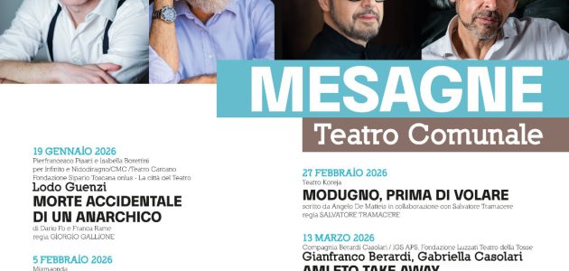 Il Teatro Comunale di Mesagne riapre le sue porte alla parola viva, al gesto e al pensiero che attraversano la scena contemporanea. La nuova stagione intreccia ironia e impegno, memoria e visione, restituendo al teatro il suo ruolo più autentico: spazio di confronto e conoscenza, luogo in cui l’arte si misura con la complessità del presente. Parte il 19 gennaio la stagione teatrale del Comune di Mesagne, 7 spettacoli in tutto, organizzata in collaborazione con Puglia Culture.