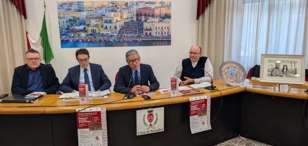 Il sindaco di Brindisi, Giuseppe Marchionna, con il prof. Teodoro De Giorgio della Società di Storia Patria per la Puglia, il prof. Thomas Christiansen dell’Università del Salento e don Mimmo Roma, parroco della Basilica Cattedrale di Brindisi, ha tenuto questa mattina, 6 novembre 2025, nella Sala “Mario Marino Guadalupi” a Palazzo di Città, la conferenza stampa di presentazione del Convegno Internazionale di Studi “Thesaurus Ecclesiae Brundusinae – San Teodoro, il soldato venuto dal mare”, promosso dall’Arcidiocesi di Brindisi-Ostuni, dal Comune di Brindisi, dalla Parrocchia della Cattedrale e dal Centro studio Teodoriani con il patrocinio del Dicastero della Cultura e dell’Educazione della Santa Sede, della Sacra Arcidiocesi Ortodossa d’Italia del Patriarcato Ecumenico di Costantinopoli e del Ministero degli Affari Esteri e della Cooperazione internazionale.