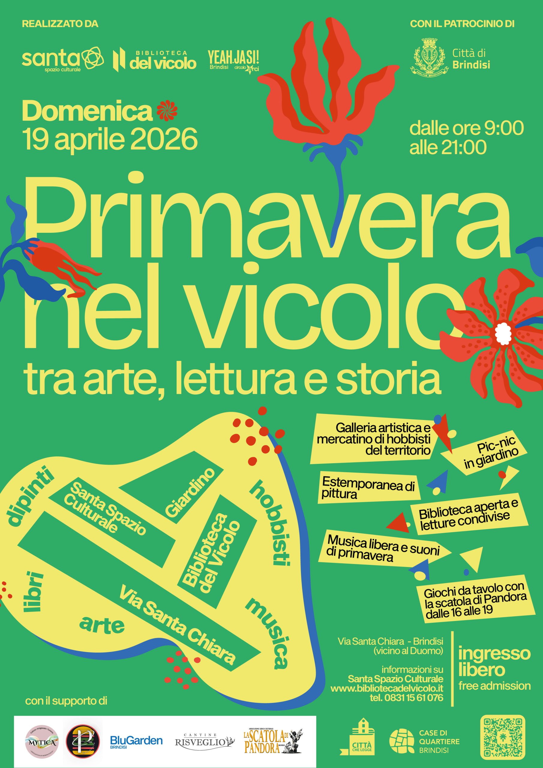Domenica 19 aprile il centro storico di Brindisi si trasforma in uno spazio vivo e condiviso con “Primavera nel Vicolo – tra arte, lettura e storia”, in programma dalle 9:00 alle 21:00 tra l’Ex Convento di Santa Chiara e via Santa Chiara.