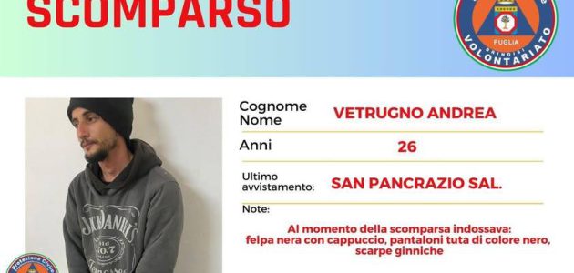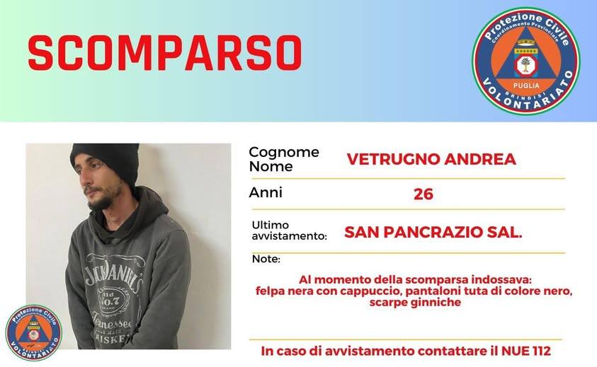 Appena denunciata la scomparsa del medesimo alla competente stazione dei Carabinieri di San Pancrazio Salentino, la Prefettura ha immediatamente disposto l’attivazione del Piano provinciale di ricerca per le persone scomparse, con il coinvolgimento di tutte le componenti del sistema di protezione civile operanti sul territorio.