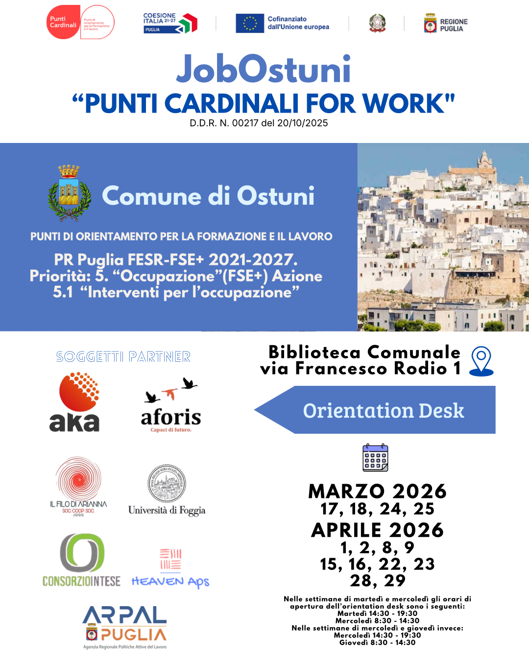 Lo sportello sarà attivo a partire dal 17 marzo 2026 presso la Biblioteca Comunale di Ostuni, in via Francesco Rodio 1, e opererà per una durata complessiva di 18 mesi, offrendo un punto di riferimento stabile per i cittadini che desiderano orientarsi tra opportunità formative e lavorative.