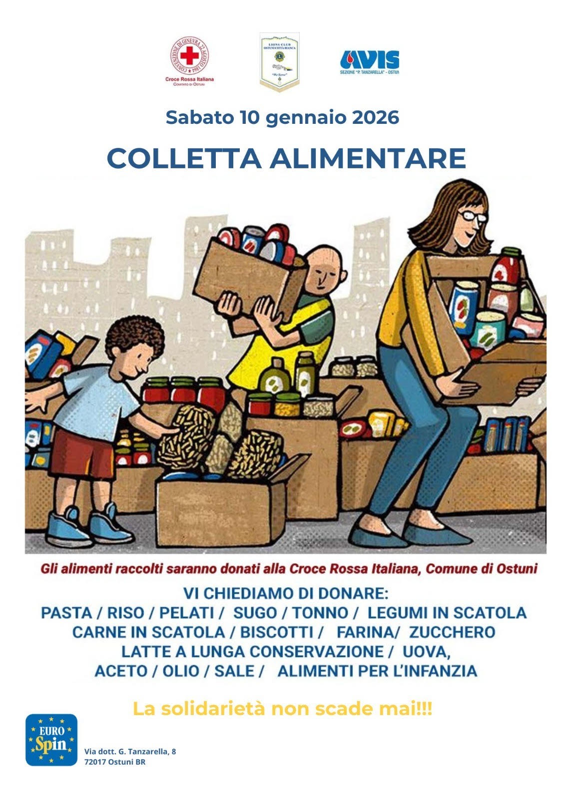 Per questo, sabato 10 gennaio 2026, il Lions Club Ostuni Città Bianca, insieme alla Croce Rossa Italiana – Comitato di Ostuni e all’AVIS Ostuni, promuove una grande Colletta Alimentare presso l’Eurospin di Ostuni (via dott. G. Tanzarella, 8), dalle ore 10.00 alle 13.00 e dalle 17.00 alle 20.30.