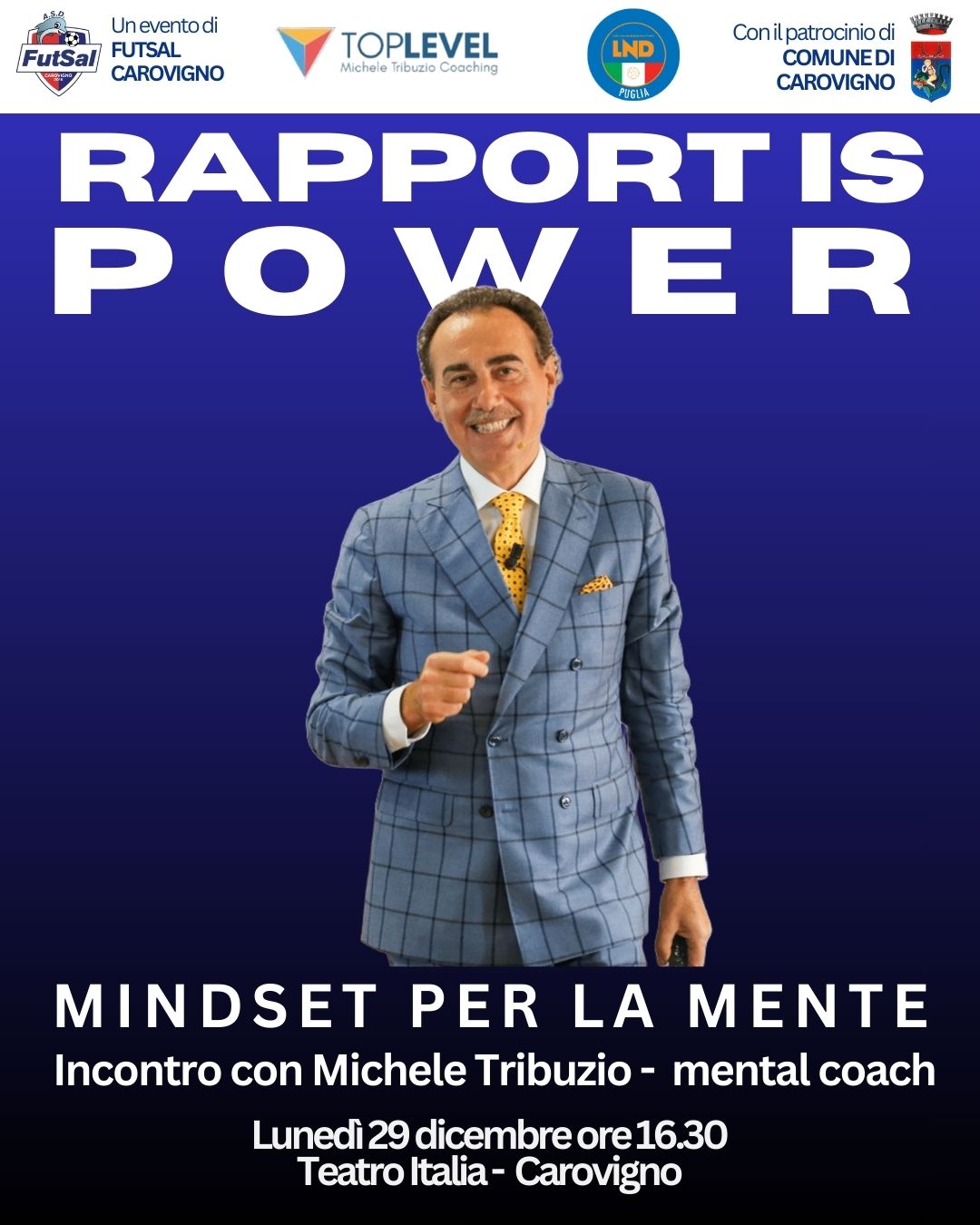 Il 29 dicembre 2025, alle ore 16:30, presso il Teatro Italia di Carovigno, si terrà “RAPPORT IS POWER”, una serata di formazione e ispirazione condotta da Michele Tribuzio, mental coach di caratura internazionale, noto anche come Zio Mike.