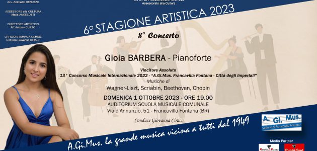 Riprende, dopo la pausa estiva, domenica 01 ottobre, alle 19.00, nell’Auditorium della Scuola Musicale Comunale, la Stagione Artistica organizzata dell’Associazione A.Gi.Mus. di Francavilla Fontana, diretta dal presidente e direttore artistico Antonio Curto.