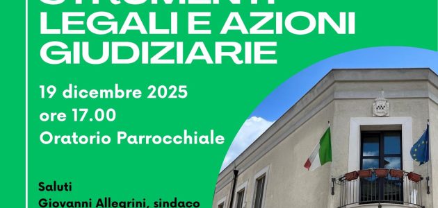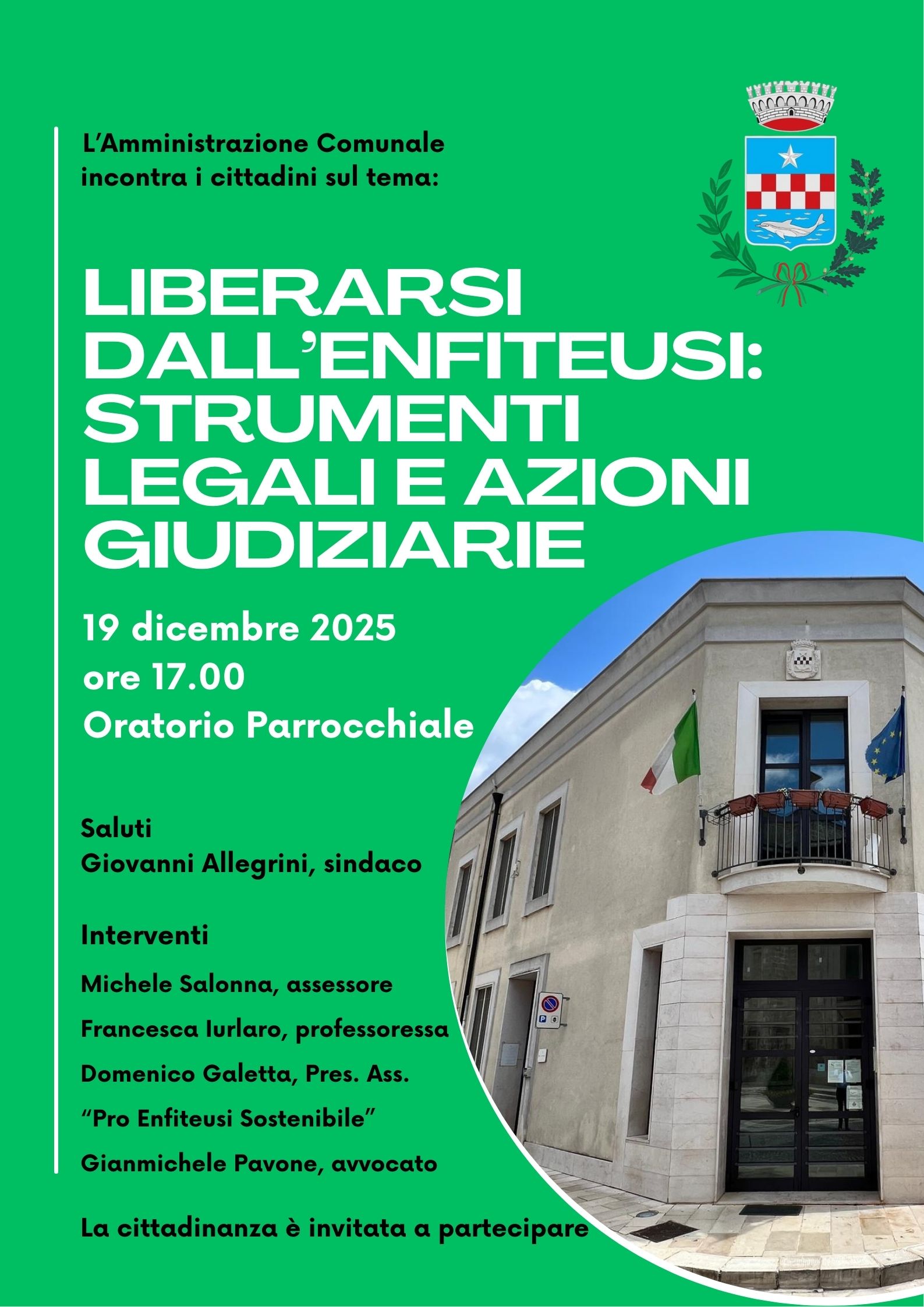 L’Amministrazione comunale di San Michele Salentino incontra i cittadini sul tema “Liberarsi dall’enfiteusi: strumenti legali e azioni giudiziarie”. L’appuntamento è fissato per venerdì 19 dicembre alle ore 17.00, presso l’Oratorio Parrocchiale di San Michele Salentino. L’incontro si colloca a poche settimane dalla seduta del Consiglio comunale in cui è stata approvata una variazione di bilancio finalizzata alla valutazione di un’azione giudiziaria sulla complessa e annosa questione dell’enfiteusi che interessa diversi terreni e abitazioni del territorio comunale.