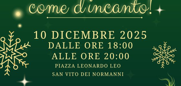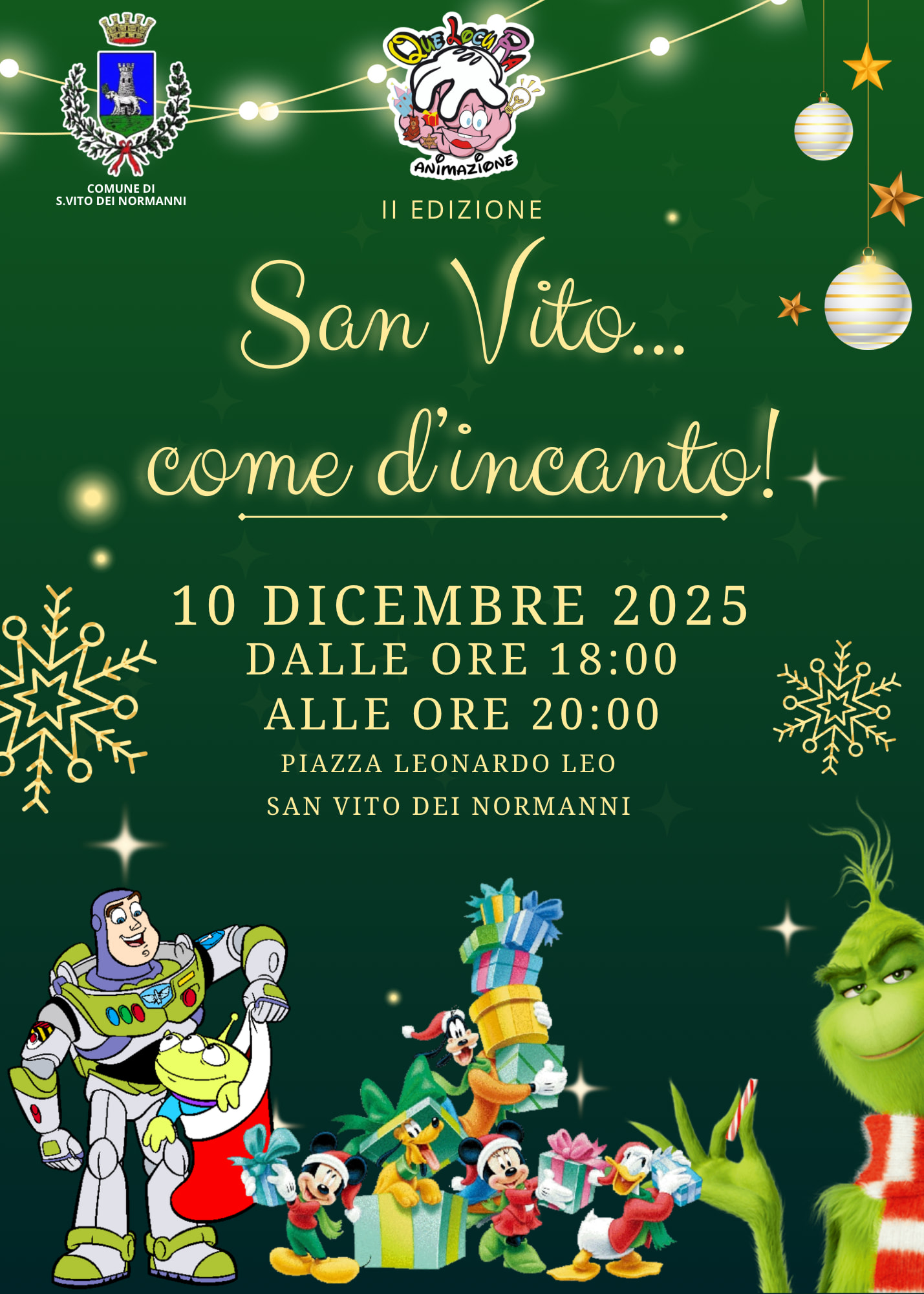 San Vito dei Normanni torna a trasformarsi in un luogo di pura meraviglia con la 2ª edizione di “San Vito… come d’incanto”, l’evento che mercoledì 10 dicembre 2025, a partire dalle ore 18.00, porterà in Piazza Leonardo Leo l’incanto dei più grandi classici del mondo Disney.