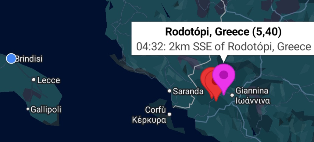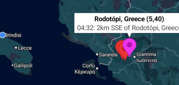 La prima e più forte scossa è stata registrata alle 04:32 con una magnitudo 5.4 della scala Richter. L’epicentro è stato localizzato nei pressi di Rodotopi, circa 2 chilometri a sud-sud-est del centro abitato, alle coordinate 39.684°N – 20.736°E, ad una profondità di 10 chilometri. Un evento sismico di questa intensità può provocare danni soprattutto agli edifici più vulnerabili.