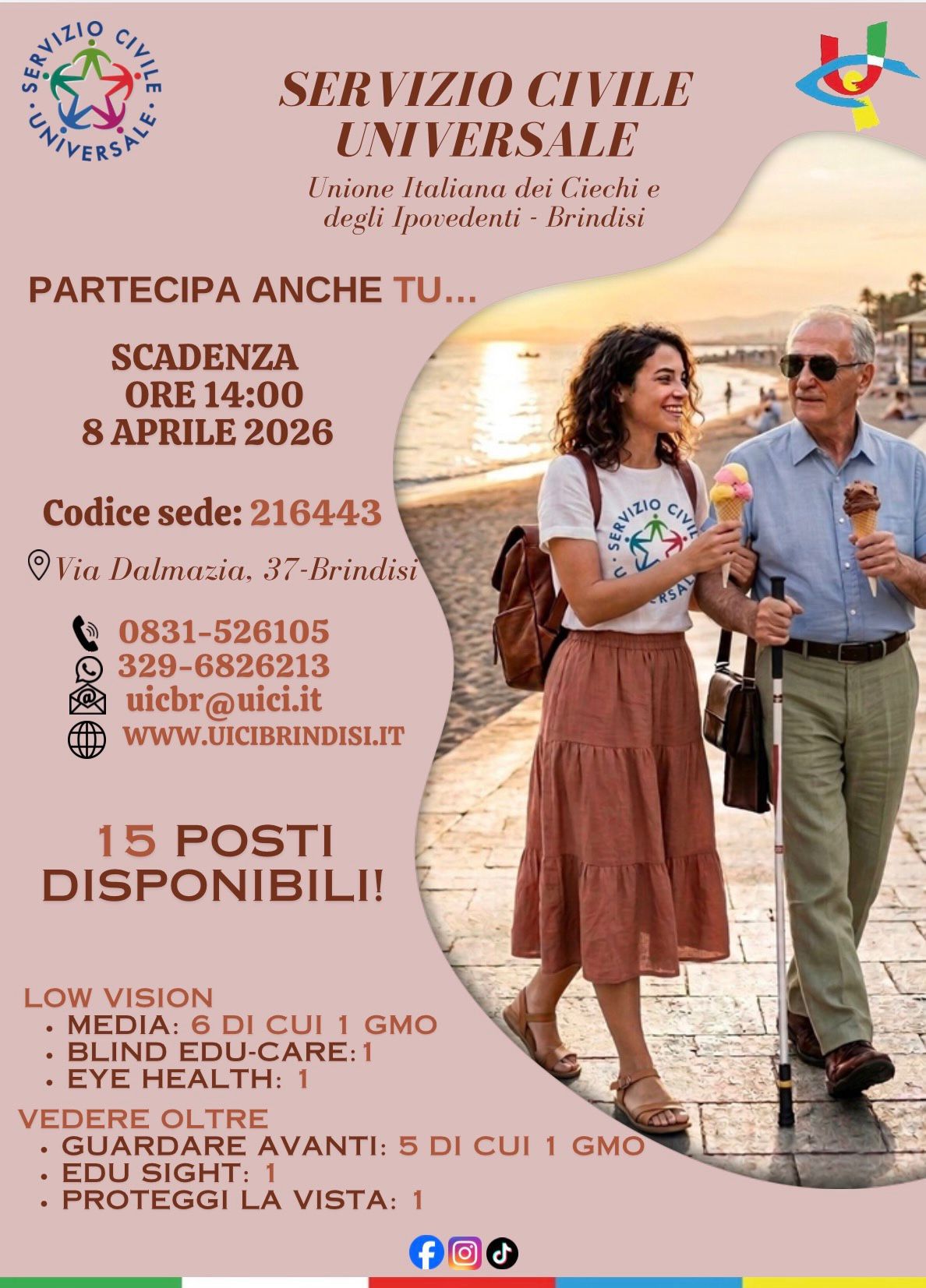 L’Unione Italiana dei Ciechi e degli Ipovedenti sezione di Brindisi recluta su tutta la provincia di Brindisi, 15 operatori volontari del Servizio Civile Universale articolati in 2 Programmi d’intervento.