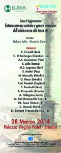 Sistema nervoso centrale e genere femminile: dall’adolescenza alla terza età. E’ il tema del corso si terrà a Brindisi il giorno 28 Marzo p.v. ed è organizzato in collaborazione da due società scientifiche nazionali, la Multidisciplinary Italian Society for Woman’s Helath (M.I.S.W.H.) e la Società Italiana di Ginecologia della Terza Età (SIGiTE). Entrambe le società scientifiche si interessano alle patologie del genere femminile con un approccio multidisciplinare coinvolgendo sulle problematiche di genere gli specialisti di tutti i settori.