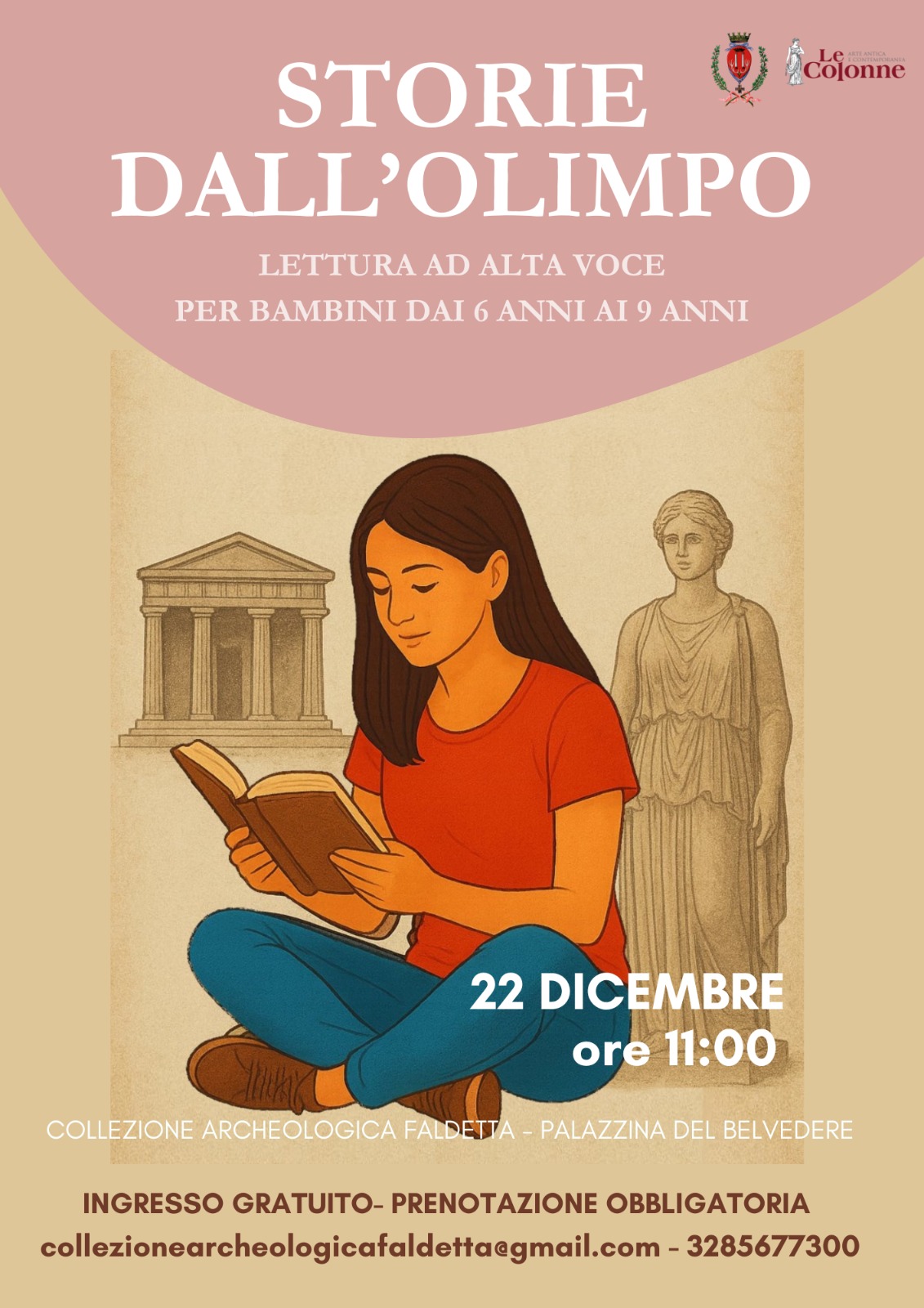 Lunedì 22 dicembre, alle ore 11.00, la Collezione Archeologica Faldetta ospita “Storie dell’Olimpo”, una lettura ad alta voce pensata per bambini dai 6 ai 9 anni.