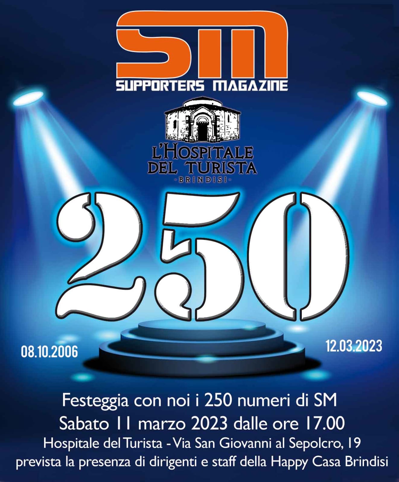 Con la nuova partita tra le mura amiche della Happy Casa Brindisi torna Supporters Magazine, il periodico di basket distribuito a Brindisi e provincia e al Pala Pentassuglia in occasione delle partite interne. E sarà un numero molto speciale: siamo arrivati al 250. Un traguardo importante che sarà celebrato con una serata speciale sabato 11 marzo 2023, dalle ore 17 in poi, presso l’Hospitale del Turista, davanti a San Giovanni al Sepolcro, a Brindisi. Sarà un momento all’interno del quale si ricorderà la storia del giornale dal primo numero uscito l’8 ottobre 2006 fino ad oggi. Saranno presenti dirigenti e staff della Happy Casa Brindisi e una rappresentanza della Limongelli Dinamo Brindisi. Tanti ospiti anche collegati in video che vorranno portare il loro saluto.