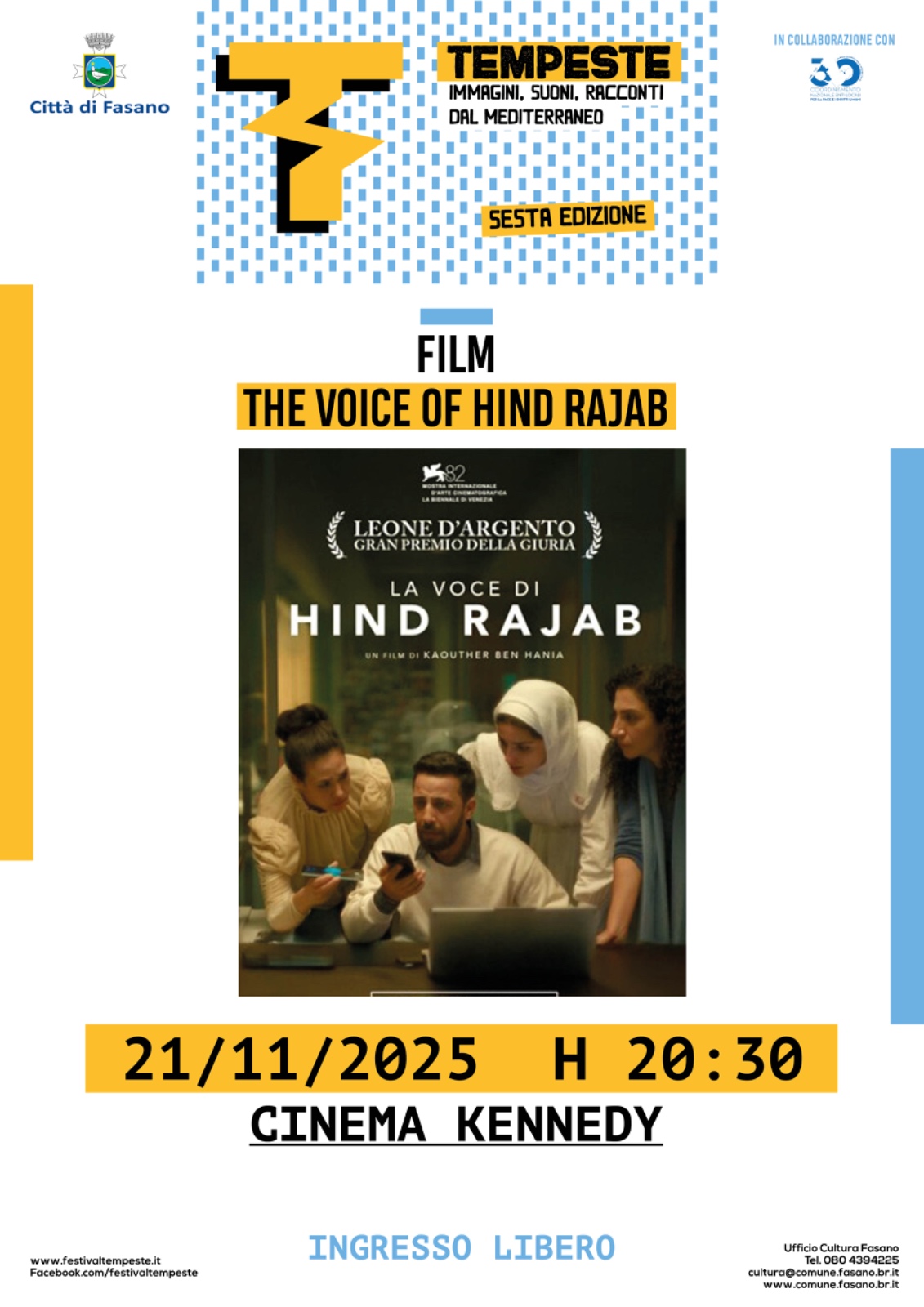 Prosegue l’impegno della Città di Fasano nella promozione del dialogo culturale e della sensibilizzazione sui diritti umani. Nell’ambito della 6ª edizione del Festival “Tempeste: Immagini, Suoni, Racconti dal Mediterraneo”, domani, venerdì 21 novembre alle ore 20.30, presso il Teatro Kennedy, sarà proiettato il documentario “The voice of Hind Rajab”.