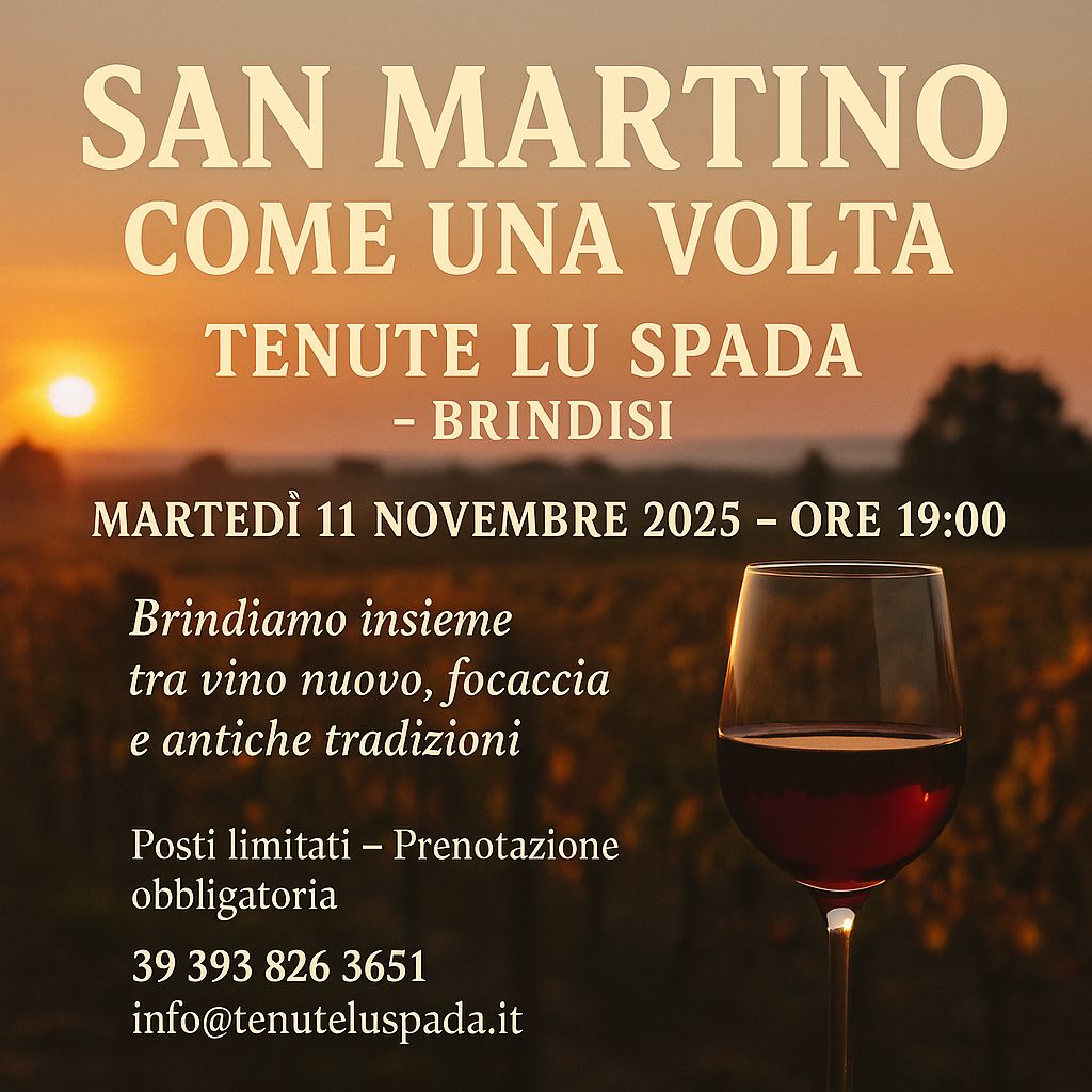 Martedì 11 novembre, dalle ore 19:00, le Tenute Lu Spada celebrano San Martino con una serata dedicata al vino nuovo, ai sapori autentici e all’atmosfera di un tempo. Un appuntamento per riscoprire la semplicità e la convivialità della tradizione contadina, tra i profumi dell’autunno e la genuinità del territorio.