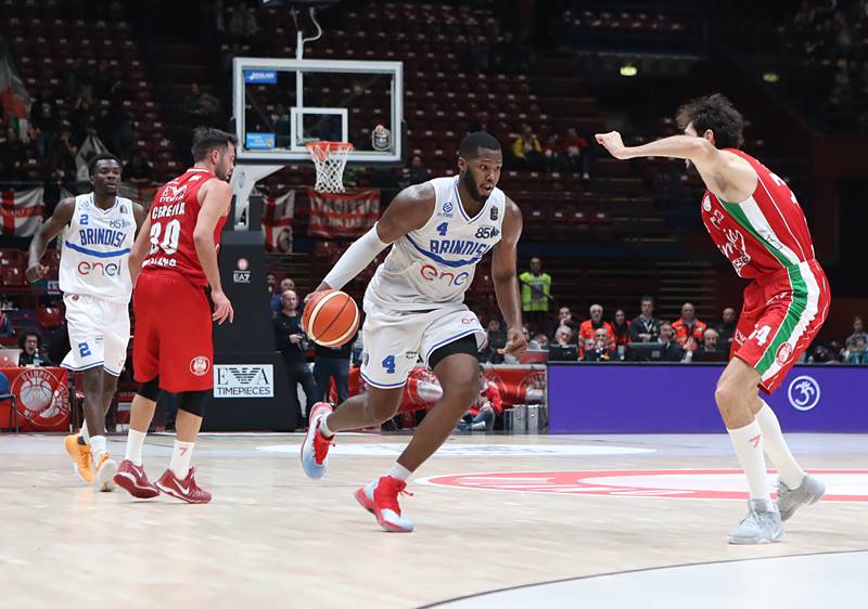 L’Enel Brindisi esce a testa alta dal Forum di Assago, chiude con un sol punto di ritardo la terza frazione (71-70) e si arrende soltanto negli ultimi cinque minuti (99-86) per la evidente differenza di lunghezza e di caratura fisica tra i due roster. Ancora una volta il carattere, la generosità e la compattezza della squadra di coach Meo Sacchetti (priva degli infortunati Joseph e Donzelli) hanno consentito all’Enel di disputare una buona prova, peraltro al cospetto dei campioni d’Italia.