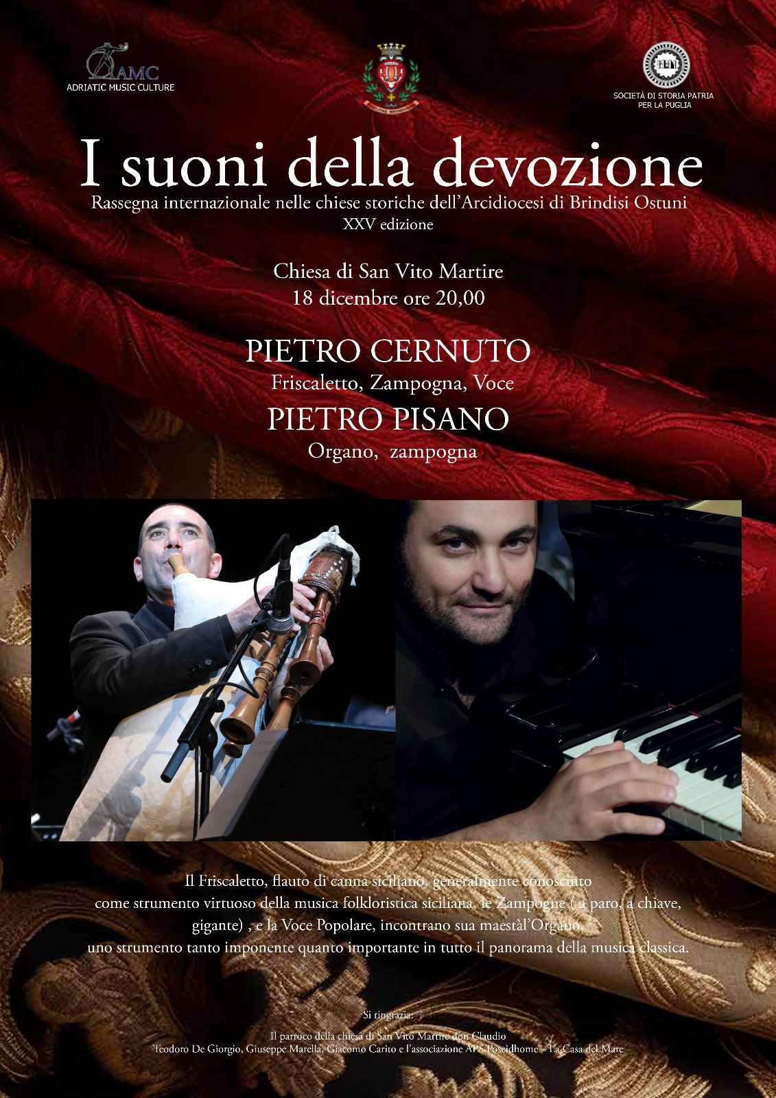 Il progetto Friscaletto – Zampogna e Organo nasce dal desiderio e dall’incontro di entrambi i musicisti Pietro Cernuto e Pietro Pisano di dare vita ad una formazione unica e diversa allo stesso tempo. Il friscaletto, flauto di canna siciliano, generalmente conosciuto come strumento virtuoso della musica folkloristica siciliana, un flauto pastorale, sì, ma con un’anima più agile, più teatrale. I suonatori siciliani lo portavano ovunque: nei mercati pieni di voci, nelle feste di paese, sotto i balconi nelle sere d’estate. Ogni friscaletto è leggermente diverso, fatto a mano, e questo lo rende così umano: nessuno suona esattamente come un altro. Le zampogne ( a paro, a chiave, gigante) e il canto popolare, incontrano in questo concerto l’organo, uno strumento tanto imponente quanto importante in tutto il panorama della musica classica. Strumenti musicali apparentemente lontani ma costruttivamente molto vicini, in quanto tutti appartenenti alla grande famiglia degli aerofoni, che incontrandosi danno vita a impasti sonori dal risultato molto gradevole all’orecchio dell’ascoltatore e molto soddisfacente alle emozioni degli interpreti. Un repertorio costituito sia da brani appartenenti al mondo della tradizione popolare, sia da brani originali composti dagli stessi esecutori pensando appositamente al particolare suono di questa formazione, sia da brani composti dai più grandi e conosciuti compositori che hanno segnato la storia della grande musica dal Barocco all’Ottocento, come Bach, Vivaldi, Hendel, ripresi ed adattati ai limiti esecutivi del Friscaletto, per arrivare anche a toccare alcune tra le melodie più conosciute nel mondo delle colonne sonore, come Gabriel’s oboe di Morricone. Il tutto scritto e arrangiato anche senza snaturare la scrittura e la bellezza musicale delle composizioni stesse, riuscendo in questo modo a valorizzare ogni strumento e a far emergere le diverse potenzialità timbriche degli stessi.